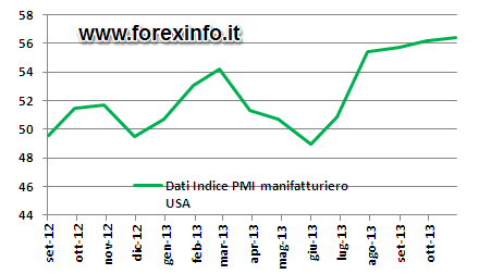 Come possiamo osservare dal grafico qui sopra, l’indice PMI manifatturiero statunitense ha mostrato un netto trend crescente a partire da Maggio 2013 (49.0), raggiungendo un massimo assoluto proprio ad Ottobre (56.4). Il settore manifatturiero USA è infatti cresciuto enormemente proprio tra settembre e ottobre, raggiungendo il livello di 56.4 dai 51.8 di Settembre. La manifattura statunitense è cresciuta nel quarto trimestre del 2013 nonostante lo shutdown del governo statunitense. Gli analisti allora attendono un valore dell’indice PMI a 55.2 proprio a causa dello shutdown.
