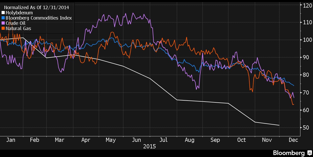 Il Molibdeno infatti viene utilizzato nella produzione di materiali in acciaio da costruzione ed è di grande aiuto alle trivelle in cerca di petrolio e gas naturali nelle zone ad alta profondità. Il prezzo di questo metallo è sceso del 49% nel 2015 (con i prezzi in flessione continua da 8 mesi) e, secondo un’indagine di Bloomberg, è risultato essere il peggior calo tra 79 materiali analizzati.