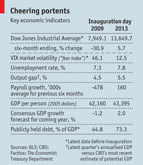 Quando Barack Obama ha prestato giuramento quattro anni fa, i dati economici erano terrificanti. Erano in pieno atto una crisi finanziaria e una selvaggia recessione economica, e i pignoramenti delle case salivano vertiginosamente. Il giorno della sua prima inaugurazione, il panico bancario ha mandato il Dow Jones Industrial Average giù di oltre 300 punti. All’inizio del suo secondo mandato, invece, il Dow è schizzato ai massimi di cinque anni, mentre un altro indice ampiamente seguito, VIX conosciuto come "l’indice della paura", ha quasi raggiunto il minimo di sei anni (vedi tabella sopra).