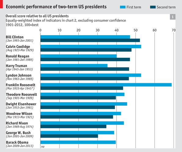 In generale nella storia, le prestazioni dell’economia sono più scarse durante il secondo mandato di un Presidente, e non durante il primo (vedi tabella sotto). Tuttavia, non è detto che sarà lo stesso per Obama. Visto che il suo primo mandato è stato così difficile, il prossimo dovrà, di diritto, essere migliore.