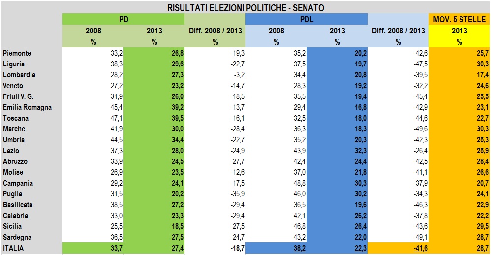 - il PDL ha perso il 41,6% circa dei consensi al Senato (dal 38,2 al 22,3%, ha perso circa 5 milioni 681mila) e il 42,2% alla Camera (dal 37,4 al 21,6%, ha perso circa 6 milioni 297mila voti);