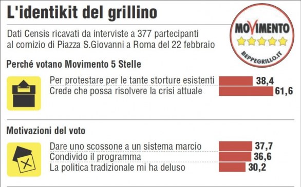 Il voto degli elettori alle elezioni 2013 è stato non solo un voto di protesta, ma un voto di frattura, inevitabilmente. Gli elettori hanno dimostrato in maniera inoppugnabile che sono stanchi dei partiti tradizionali e vogliono cambiare qualcosa in un Paese politicamente fermo da troppo tempo. Qualcuno ha scelto l’astensionismo, scoraggiato dall’assenza di progetti validi e alternativi, qualcun’altro ha scelto Grillo, che non ha fatto altro che sfruttare abilmente questo malcontento. Chi ha portato Grillo alla vittoria?