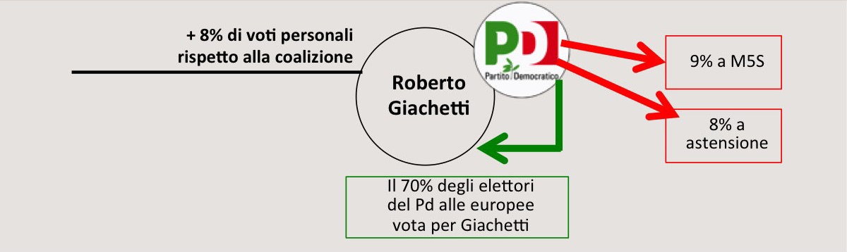 Roberto Giachetti - che al primo turno ha ottenuto il 24,87% dei consensi e sfiderà la Raggi al ballottaggio - ha conquistato un +8% di voti personali rispetto alla sua coalizione, ricevendo il voto del 70% di coloro che alle europee del 2014 avevano scelto Pd.