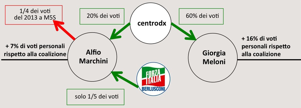Marchini era appoggiato da Forza Italia, ma ha ottenuto soltanto ⅕ dei voti del partiti guidato da Berlusconi, e ha ceduto ai 5Stelle ¼ dei voti ottenuti alle comunali del 2013. Anche nel caso del costruttore romano, si registra una buona affermazione personale rispetto alla coalizione che lo sosteneva (+7%).