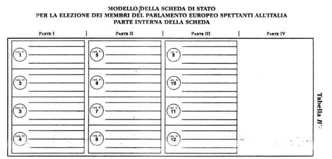 l’Italia è divisa in 5 grandi circoscrizioni: Italia nord-occidentale, Italia nord-orientale, Italia centrale, Italia meridionale, Italia insulare. Ad ogni circoscrizione è assegnato un numero di seggi stabilito in base dell’ultimo censimento generale della popolazione. Le schede per la votazione sono di colori diversi a seconda della circoscrizione in cui si vota.