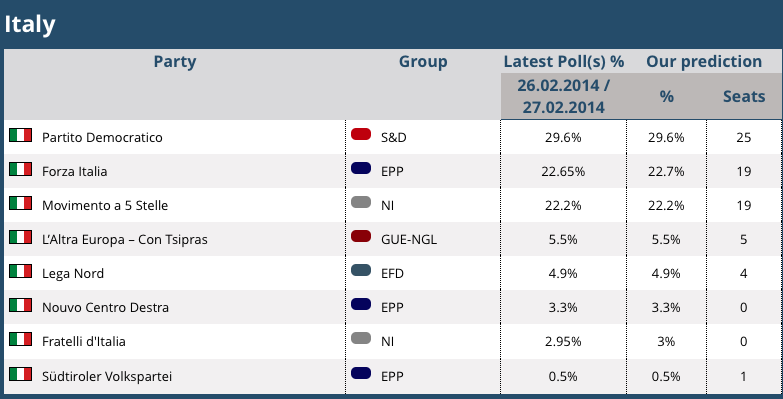 PollWatch2014, il sito internet lanciato dall’associazione indipendente Vote Watch ha appena pubblicato i dati relativi alle previsioni per quanto riguarda l’Italia.