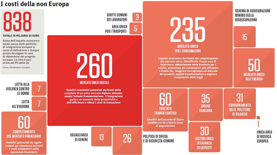 Il rapporto è stato stilato del centro studi dell’Europarlamento, attore forse non molto imparziale, nella discussione tra pro e contro Unione. Alla luce dei dati però la rinuncia alla serie di riforma e passi avanti verso la totale integrazione comunitaria avrebbe un costo di circa 800 miliardi l’anno.