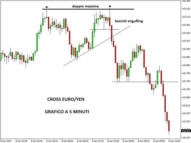 Quando si concretizza questo pattern di inversione del trend, si forma anche un segnle della candlestick analysis molto affidabile. Si tratta del bearish engulfing, che fa scattare lo short intraday sul cross euro/yen. Il rischio è davvero molto basso. In pratica si entra short sulla rottura del minimo del pattern, ovvero a 143,05 e si posiziona lo stop loss qualche pip sopra il massimo swing del mercato (143,16). Dopo poco più di due ore di trading, il mercato mostra un robusto sell-off con i prezzi che crollano sotto 142,50.