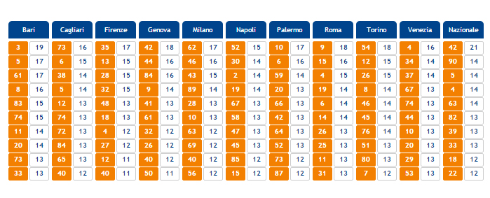 Ecco invece una tabella presa dal sito della Lottomatica in cui vengono elencati i numeri che escono frequentemente sulle varie ruote e quindi possono essere considerati fortunati.