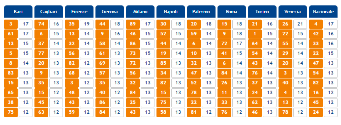 Ecco invece una tabella presa dal sito della Lottomatica in cui vengono elencati i numeri che escono frequentemente sulle varie ruote e quindi possono essere considerati fortunati.