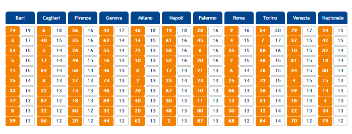 Ecco invece una tabella presa dal sito della Lottomatica in cui vengono elencati i numeri che escono frequentemente sulle varie ruote e quindi possono essere considerati fortunati.