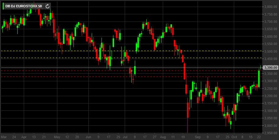 L’indice azionario comprendente le 50 maggiori aziende dell’Eurozona ha chiuso la giornata di ieri con un ottimo +3,34% e oggi è ripartito con grande entusiasmo, forte dell’afflusso di capitali che non conosce sosta.
