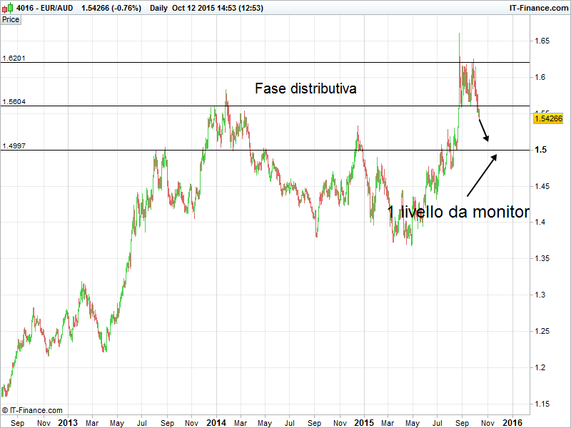 Questo mix di fattori ha determinato dal punto di vista dell’analisi tecnica, la rottura del livello di 1.56 che reggeva la fase laterale di Euro Aud, e ha fatto partire il trend di ribasso. A che livelli ci possiamo attendere che possa arrivare il movimento discendente?