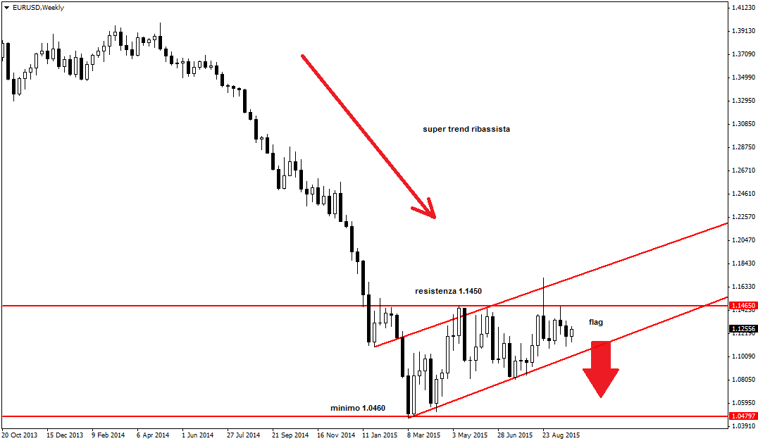 1- Da un punto di vista tecnico, su base weekly il grafico di EUR/USD sta mostrando una tipica flag di continuazione del trend primario, che nelle prossime settimane potrebbe favorire il ripristino della tendenza principale in caso di breakout ribassista esplosivo dei supporti chiave di 1,11 prima e 1,08 poi. Intorno a 1,1450 al momento è presemta una super resistenza, che appare molto difficile da superare.