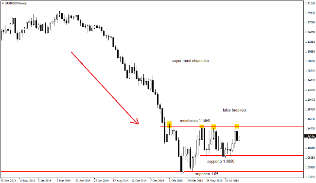 Il tasso di cambio Euro/Dollaro ha vissuto una settimana di trading esaltante tra il 19 e il 24 agosto, passando da area 1,10 a oltre 1,17 in poche sedute. Il rally ha spinto la quotazione sui massimi da metà gennaio scorso, mettendo in grande imbarazzo Mario Draghi e il resto del board della BCE che solo pochi mesi fa avevano lanciato il piano di quantitative easing per deprezzare la valuta allo scopo di risollevare l’inflazione e l’economia dell’intera unione monetaria. Tuttavia il boom dell’euro si è rapidamente sgonfiato, tanto che il cambio EUR/USD si è riportato sotto 1,12 in un clima di elevata volatilità di breve termine provocata dal terremoto finanziario cinese.