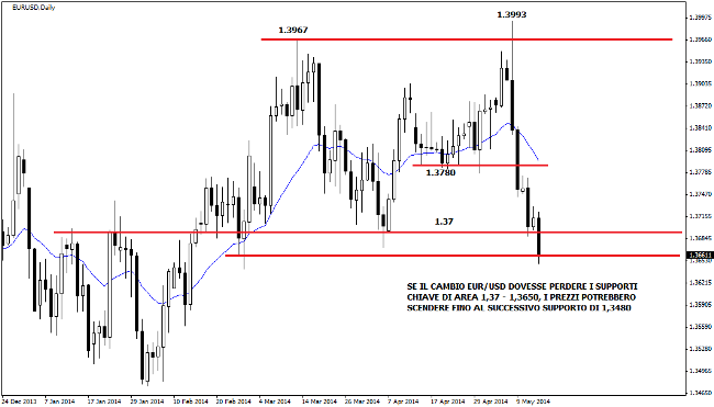 Giornata molto negativa per l’euro sui mercati valutari a causa del rallentamento della ripresa economica nell’eurozona e del taglio delle stime di inflazione della BCE, che alimentano maggiori aspettative per un imminente stimolo monetario a giugno. La stima preliminare del pil dell’eurozona nel primo trimestre mette in evidenzia una crescita dello 0,9% su base annua, meglio dello 0,5% della precedente lettura ma comunque sotto le attese del mercato che erano ferme a +1,1%. Rispetto agli ultimi tre mesi dello scorso anno, il pil è cresciuto dello 0,2%, meno delle aspettative degli analisti ferme a +0,4%. Per il 2014 la crescita è attesa all’1,1%, mentre nel biennio 2015-2016 dovrebbe salire rispettivamente all’1,5% e all’1,7%.