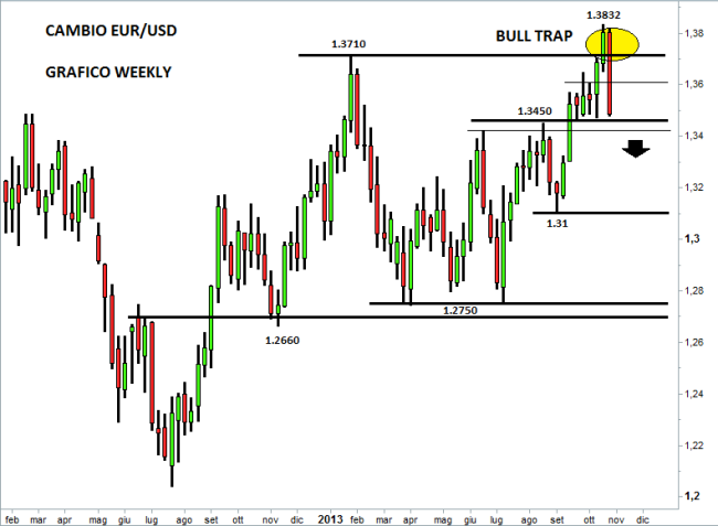 Da un punto di vista tecnico, se si analizza con attenzione il grafico weekly, si può notare la presenza di una "bull trap" (trappola per tori, ovvero per compratori) sopra 1,38, scattata pochi giorni dopo il superamento dei precedenti top dell’anno di 1,3710. I large traders si sono posizionati velocemente al ribasso, mentre chi era ancora long ha venduto frettolosamente per non essere travolto dall’ondata di vendite. I top di periodo di 1,3832 sono tra l’altro situati sul 61,8% del ritracciamento di Fibonacci della gamba ribassista iniziata a maggio 2011 a 1,4940 e terminata a fine luglio 2012 in area 1,2040.