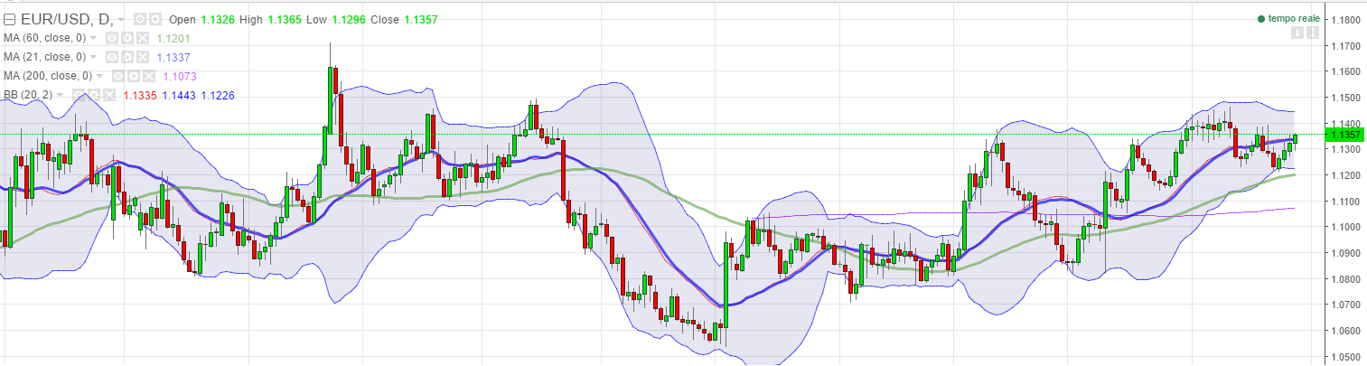 Qualche giorno fa il cambio ha toccato la parte più bassa delle bande di Bollinger, che suggerisce un movimento verso la parte più alta delle bande a quota $1,1441. Il RSI segnala un rialzo muovendosi verso la zona di ipercomprato e staccandosi dalla zona di neutralità.