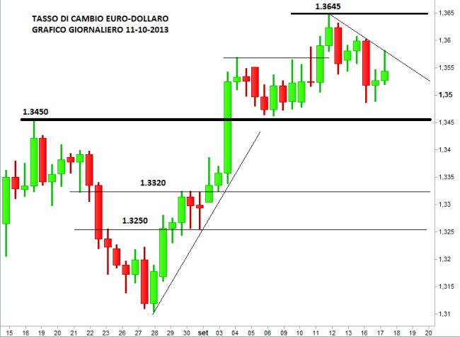 Partenza con pochi spunti degni di nota sui mercati valutari, a causa dei bassi volumi dovuti alla festività del Columbus Day. I mercati obbligazionari americani resteranno chiusi e ciò dovrebbe influenzare sensibilmente gli scambi sul forex. Chiusa anche la borsa di Tokyo. In attesa di schiarite dalla vicenda del tetto all’indebitamento pubblico negli Stati Uniti, sul forex il tasso di cambio euro-dollaro si sta muovendo poco sopra 1,3560 dopo aver chiuso la scorsa ottava appena sotto quota 1,3550. Per il resto della seduta odierna non sono attese oscillazioni rilevanti e i prezzi dovrebbero restare sotto la soglia di 1,36.