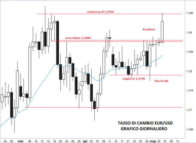 Euro/Dollaro: breakout e allungo fino a 1,3950. Domani i tassi BCE