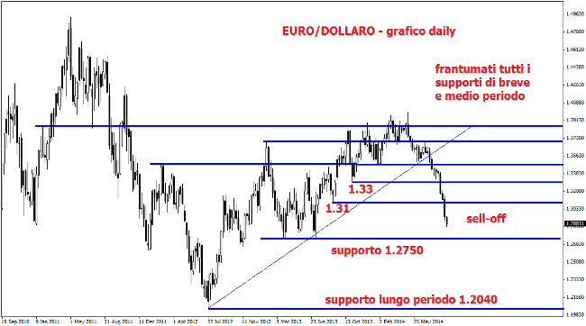 Non si ferma la discesa del tasso di cambio EUR/USD, che stamattina ha toccato il minimo più basso degli ultimi 14 mesi poco sotto 1.2860. Prossimo target a 1.2750