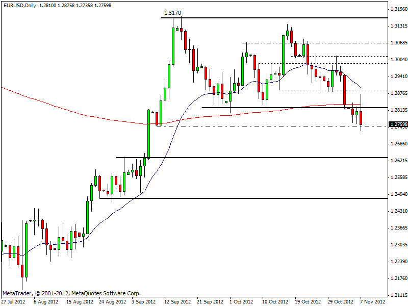 Brusca inversione del trend per il tasso di cambio euro/dollaro, che questa mattina sembrava poter ambire a importanti risultati dopo l’euforia iniziale post-elezioni negli Stati Uniti. Dopo essere salito fino a poco sotto la key area di 1,2880, i venditori hanno ripreso in mano la situazione spingendo il cambio fin sotto il supporto giornaliero di 1,2750. I prezzi sono scesi fino a 1,2737, toccando così il minimo più basso degli ultimi due mesi.