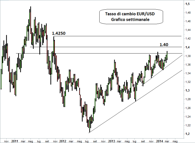 Su un orizzonte temporale di medio termine ci sono buone chance di proseguire il rally. Roberto Mialich, responsabile della ricerca cambi per Unicredit, si aspetta che il cambio euro/dollaro si stabilizzi nella fascia di prezzo compresa tra 1,35 e 1,40, posizionandosi però soprattutto nella parte alta della forchetta. L’esperto sottolinea che “l’euro ha mostrato una certa impermeabilità a fattori potenzialmente negativi per la crescita, come la crisi degli emergenti o l’avvio del tapering della Federal Reserve”.