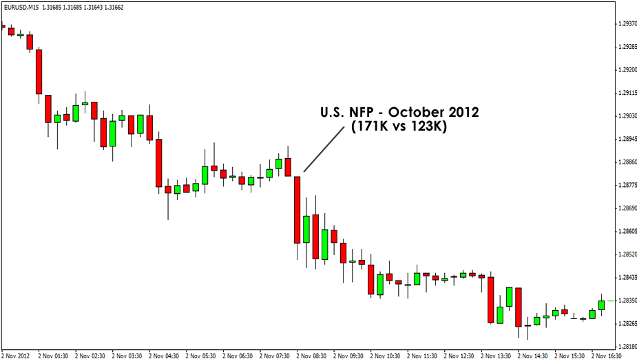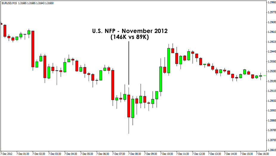 Stando ai grafici analizzati da Babypips e relativi alle ultime letture, possiamo dire che la pubblicazione dei NFP e l’andamento del Dollaro sono positivamente correlati e, di conseguenza, una lettura migliore delle attese per il mese di dicembre potrebbe portare ad un sell-off sul cambio Euro/Dollaro.