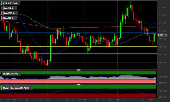L’Euro-Dollaro scambia in territorio negativo nelle prime battute della mattinata. Il cross segna al momento un ribasso del -0,14% a quota 1,0946$ in attesa dei dati sui non-farm payrolls (NFP) e il tasso di disoccupazione degli Stati Uniti.