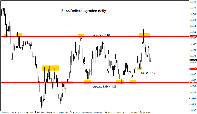 L’agenzia di rating americana si aspetta poi che la FED rimandi ancora la decisione di incrementare i tassi di interesse nella prossima riunione del 16 e 17 settembre. Ciò potrebbe avere un impatto molto negativo sul dollaro americano, che nelle ultime sedute è apparso in forte ripresa dopo la discesa di fine agosto durante la fase di panic selling sui mercati. Questo scenario sarebbe favorevole al cambio Euro/Dollaro, che potrebbe risalire rapidamente la china spingendosi nuovamente in area 1,14 – 1,1450. Difficile pensare, invece, a un ritorno dei prezzi sui massimi di area 1,17, che risalgono al picco del 24 agosto scorso.