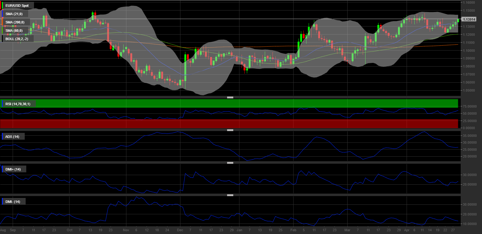 Il RSI segnala una fase positiva vista la direzione intrapresa dall’indicatore verso l’area di ipercomprato. L’ADX invece sembra segnalare una ripresa della forza del trend rialzista con il +DM incrociato al di sopra del -DM. L’ADX sta su valori intorno a 27 muovendosi verso l’alto, suggerendo così una maggiore forza del trend in atto.