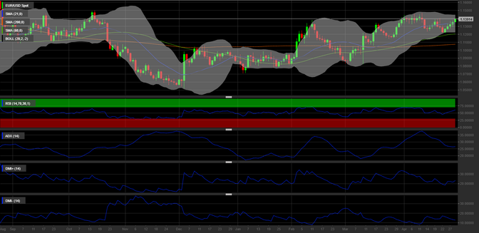 Il quadro grafico del cambio Euro-Dollaro rimane sempre positivo. Le medie mobili sono incrociate tutte a rialzo, dando spunti per ulteriori allunghi nelle prossime sedute. Il cross ha rotto ieri la zona di resistenza offerta dalla media mobile di breve periodo, trovandosi adesso a testare i massimi del 19 aprile.