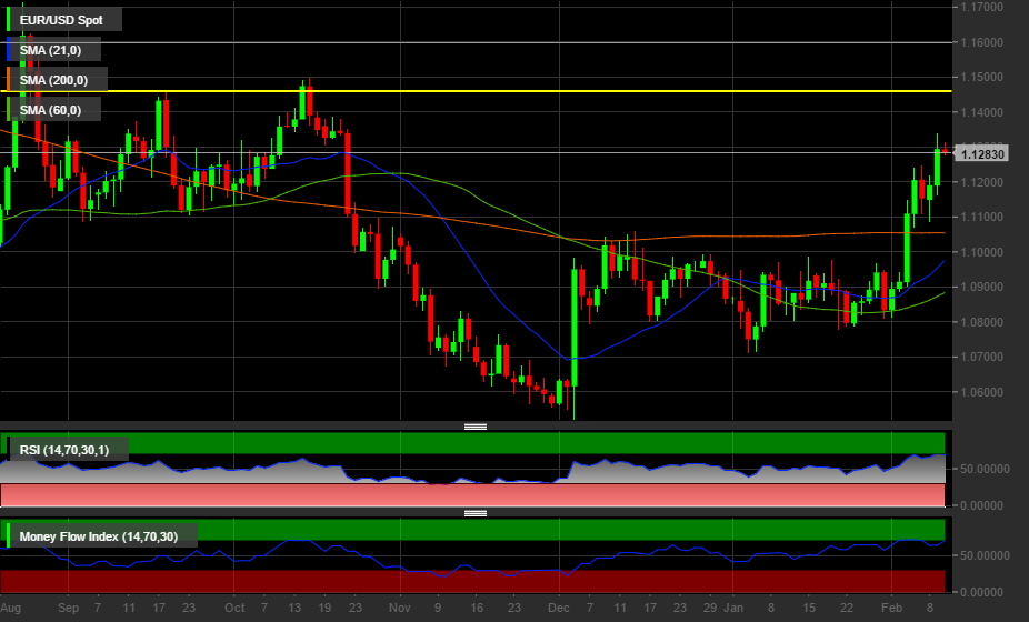 Nella seduta di ieri è continuato il rialzo del cambio Euro-Dollaro che è arrivato a toccare i massimi intraday a quota 1,1337, dirigendosi così verso quota 1,15. Al momento il cross è in leggera flessione dello 0,08%, pari ad un livello di 1,1285.