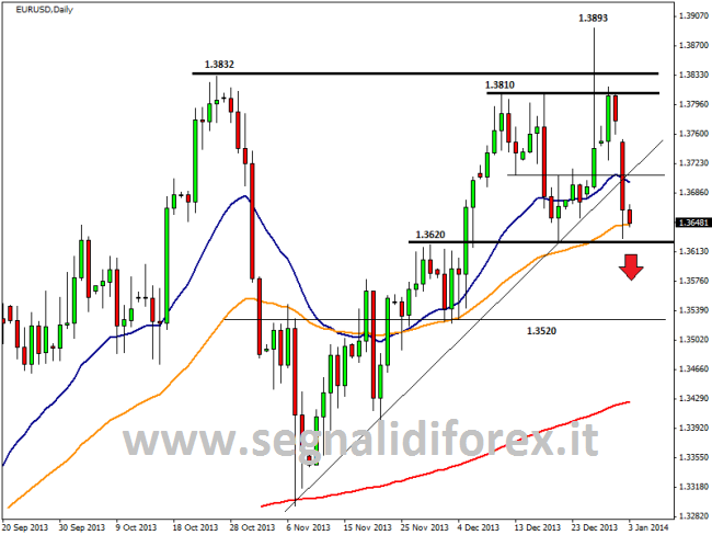 Nonostante Mario Draghi ha allontanato per ora l’ipotesi di un nuovo taglio dei tassi di interesse, la BCE potrebbe ben presto essere costretta a lanciare nuove misure espansive di politica monetaria per rilanciare il credito e quindi l’economia. Si parla da tempo di tassi sui depositi presso la BCE su valori negativi o di una nuova LTRO. Vedremo quali saranno le prossime mosse dell’Eurotower, che tiene sempre sotto controllo le potenziali pericolose spinte deflazionistiche. Il cambio euro/dollaro potrebbe aver raggiunto un top importante poco sotto 1,39 e a questo punto diventa sempre più credibile l’ipotesi di una discesa fino a 1,35 – 1,34 nelle prossime settimane. Nel breve termine va seguito l’eventuale breakout del supporto di 1,3620: in caso di violazione del livello, i prezzi potrebbero accelerare vistosamente al ribasso.