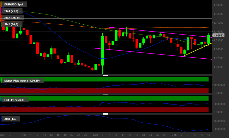Il quadro tecnico del cambio Euro-Dollaro sembra che stia cominciando a prendere spunti rialzisti dopo le indecisioni degli ultimi giorni. Il cross oggi ha preso forte slancio rompendo a rialzo la flag e proiettandosi a testare la resistenza posta dalla media mobile a 200 giorni a quota 1,1050.