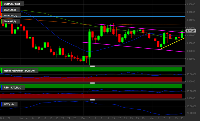 L’Euro acquista forza sul Dollaro USA grazie al crollo dei prezzi del petrolio, al surplus commerciale dell’Eurozona e ai dati macro in chiaroscuro statunitensi. Il cross Euro-Dollaro al momento in cui si scrive tratta in rialzo del +0,72% a quota 1,0942 allungando i progressi registrati in mattinata. Il cambio potrebbe testare i massimi dell’11 Gennaio che, se superati, porterebbero ad un allungo verso quota 1,1.