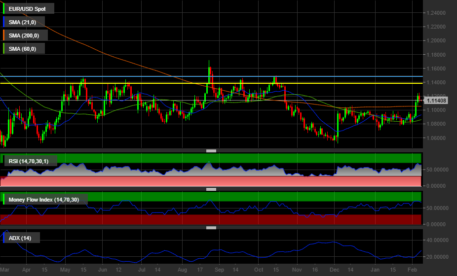 Il quadro grafico del cambio Euro-Dollaro rimane rialzista nel breve-medio periodo. Le medie mobili di breve e medio periodo sono ancora incrociate a ribasso con quella a lungo termine, pur tuttavia avendo preso la direzione di quest’ultima. Il cross ha rotto tutte le resistenze poste dalla media mobile a 21 giorni e a 200 giorni, andando a toccare i massimi a 1,1246. La rottura dell’altro massimo a quota 1,1239, toccato il 4 Febbraio, lascia pensare che il cambio tornerà a testare tali livelli.