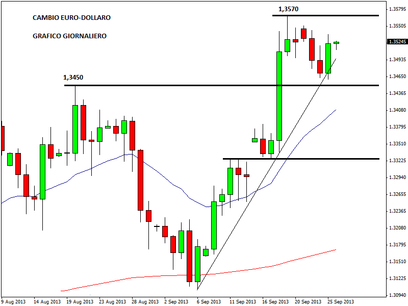 Nella seduta di ieri il tasso di cambio euro-dollaro è riuscito a trovare un solido supporto in area 1,3460, poco distante dalla key area di 1,3450 (resistenza toccata il 20 agosto scorso). Da questi livelli la moneta unica ha cominciato un graduale rimbalzo tecnico fino a portarsi sopra la soglia di 1,35. I compratori sono aumentati sempre più nel corso della giornata, complice la debolezza generalizzata del biglietto verde che paga le incertezze sul tapering e i timori di un possibile default tecnico sul debito USA in caso di mancato accordo al Congresso sul rinnovo delle misure straordinarie relative all’innalzamento del tetto al debito pubblico (debt ceiling) e ai tagli alla spesa federale.