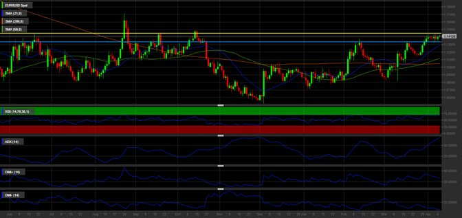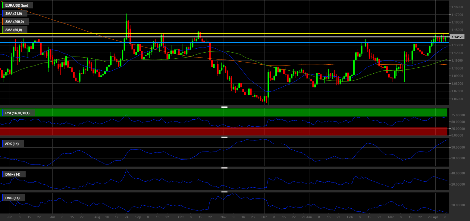 Gli indicatori tecnici continuano a segnalare la fase di rialzo del cambio, con il RSI in zona di ipercomprato e con l’ADX su valori elevati con il +DM ben al di sopra del -DM.