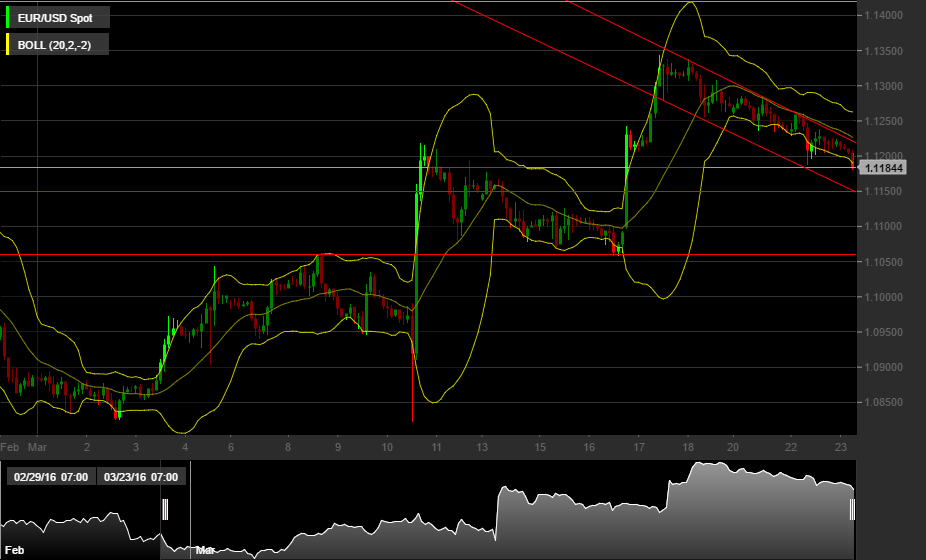 La parentesi al di sopra di quota 1,13 è stata però di breve durata e dal 17 marzo il cambio euro-dollaro si è creato un forte canale ribassista di breve periodo, evidenziato dalle due trendline di colore rosso nel grafico.