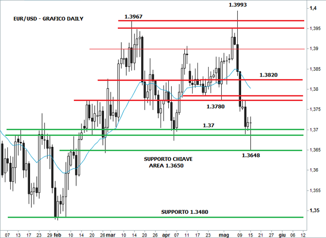 Il tasso di cambio euro/dollaro ha formato ieri una candela di esaurimento del trend a seguito dell’approdo sull’area di supporto di 1,3650. I prezzi erano riusciti a perforare anche l’ampia area di supporto posta tra 1,37 e 1,3670, ma il successivo ostacolo tecnico ha favorito i compratori. Lo swing di ieri è senza dubbio un segnale di sostanziale miglioramento del quadro tecnico di breve periodo, che però sarebbe immediatamente negato in caso di brusca discesa sotto quota 1,3640. Il cambio ha toccato ieri il minimo più basso da fine febbraio scorso a 1,3648, arrivando così a perdere il 2,5% rispetto ai top di 1,3993 toccati appena una settimana prima.