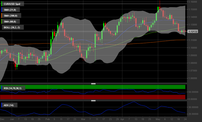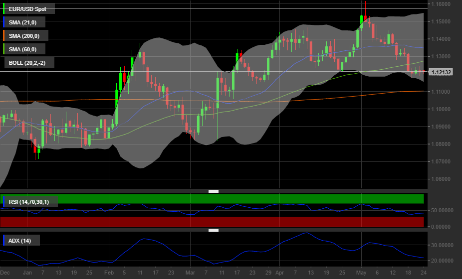 Il cambio Euro-Dollaro avvia la seduta odierna in territorio negativo. Il cross al momento tratta in lieve ribasso del -0,07% pari ad una quotazione di $1,1213. Il cambio nella sessione di ieri è stato oggetto di volatilità a causa della pubblicazione dell’importante dato sull’indice PMI (manifatturiero e dei servizi) dell’Eurozona preliminare di maggio.