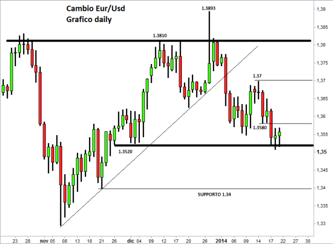 La giornata di ieri è stata caratterizzata dalla pubblicazione di un deludente indice Zew tedesco, che è risultato in calo e sotto le aspettative del mercato. Sul forex l’euro è rimasto sotto pressione, dimostrando ancora una volta di non essere nel suo miglior momento. Il tasso di cambio euro/dollaro continua a muoversi sotto 1,3550 e a questo punto potrebbe avvenire l’assalto definitivo dei venditori all’area di supporto di 1,35, che se violata al ribasso potrebbe aprire la strada a un approfondimento bearish fino a 1,34, livello minimo che risale allo scorso 21 novembre. A gennaio l’indice Zew relativo alle aspettative economiche in Germania è diminuito a 61,7 punti dai 62 punti dello scorso mese. Gli analisti finanziari si aspettavano un miglioramento a 64 punti.