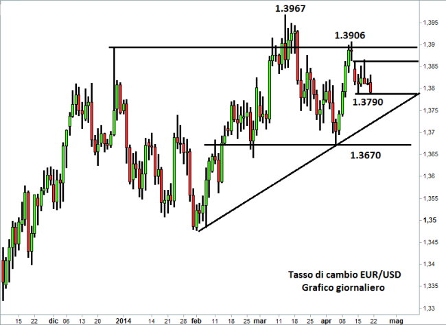Il clima di festività per le vacanze di Pasqua ha tenuto lontano dai mercati i grandi investitori. Ciò ha provocato una drastica riduzione degli scambi e un significativo decremento della volatilità. Il tasso di cambio euro/dollaro è tornato a muoversi nella sessione di ieri, ma il range giornaliero è rimasto contenuto a causa di scambi decisamente limitati. Il cambio euro/dollaro ha chiuso la seduta con una flessione dello 0,14% a 1,3792, toccando il minimo più basso degli ultimi dieci giorni a 1,3787.