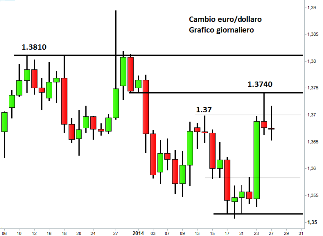 Il tasso di cambio euro/dollaro è stato respinto ieri sull’area di resistenza di 1,37, mentre venerdì i prezzi erano andati a sbattere contro un’altra resistenza daily posta a 1,3740. La risalita del cambio c’è stata, dopo che il nuovo anno si era aperto con un ribasso piuttosto robusto. Le quotazioni avevano sfiorato 1,35 ai minimi da oltre un mese, ma l’ottimo andamento degli indici PMI nell’eurozona ha risollevato il cambio fino a riportarlo sopra 1,37.