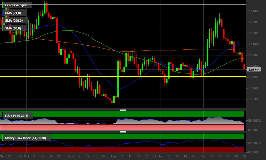 L’Euro-Dollaro è sprofondato sotto quota 1,09$ dopo la pubblicazione del dato sull’inflazione UE. Quasi certo che la BCE agirà nella prossima riunione di marzo.