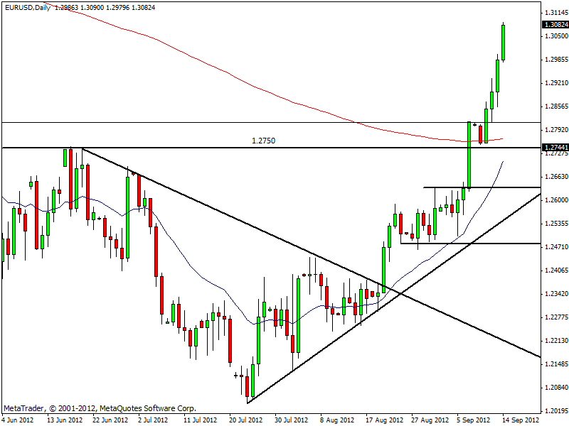 Il tasso di cambio euro/dollaro ha accelerato ancora al rialzo a metà mattinata, dopo un breve ritracciamento fisiologico intraday. La quotazione di euro/dollaro ha raggiunto 1,3090, toccando così il livello più alto da oltre 4 mesi. Non si ferma, quindi, la corsa all’acquisto da parte degli investitori, ancora euforici per l’annuncio del QE3 da parte della FED.