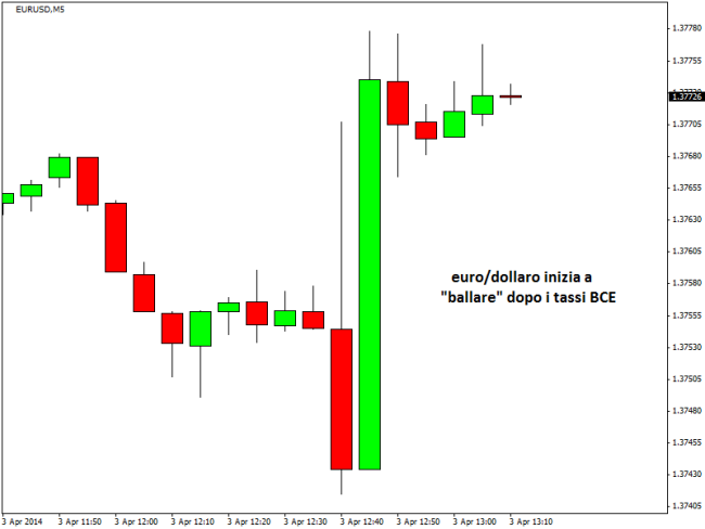 Dopo la comunicazione dei tassi da parte della BCE, il cambio euro/dollaro si è mosso tra 1,3780 circa e 1,3740 ma con l’inizio della conferenza stampa di Draghi è molto probabile un vero e proprio boom dei prezzi: se al rialzo, il cambio potrebbe superare quota 1,38 e puntare ai top di area 1,3970 del 13 marzo scorso; se al ribasso, i prezzi dovrebbero violare il supporto di 1,37 e allungare fino a 1,3640 o addirittura 1,3550.