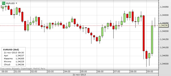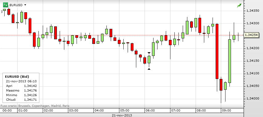 Prima della release francese il cambio Euro/Dollaro era scambiato in zona 1.3425, ma al momento della release vediamo una lunga candela ribassista che ha portato il cambio da un massimo di 1.3430 ad un minimo di 1.3398