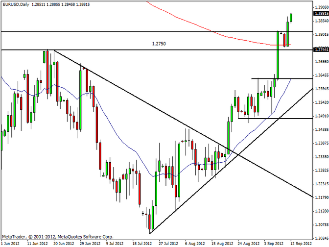 Il tasso di cambio euro/dollaro è in forte guadagno da ieri pomeriggio. Dopo aver superato con decisione la resistenza di area 1,2820, i prezzi hanno messo il turbo superando anche quota 1,2880. La soglia di 1,29 è ormai a un passo e potrebbe essere già sfondata nelle prossime ore, per permettere ai prezzi di dirigersi verso il target psicologico di 1,30.